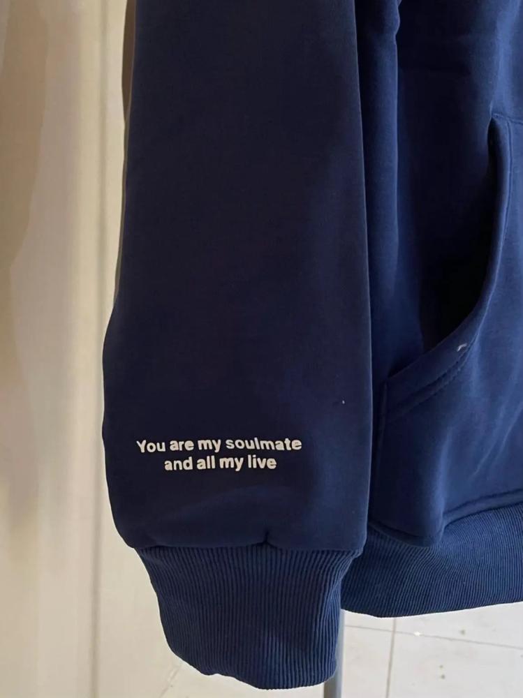 يمكنك اختيار النص الجاهز "فيني منك" أو "فيك مني" ليعبر عن علاقتك الخاصة، أو كتابة نص مخصص يعبر عن مشاعرك بأسلوبك الخاص. بالإضافة إلى ذلك، أضف لمسة فاخرة برسالة جانبية مخصصة على الكمّ لتجعل الهودي أكثر تميزًا وتفردًا.